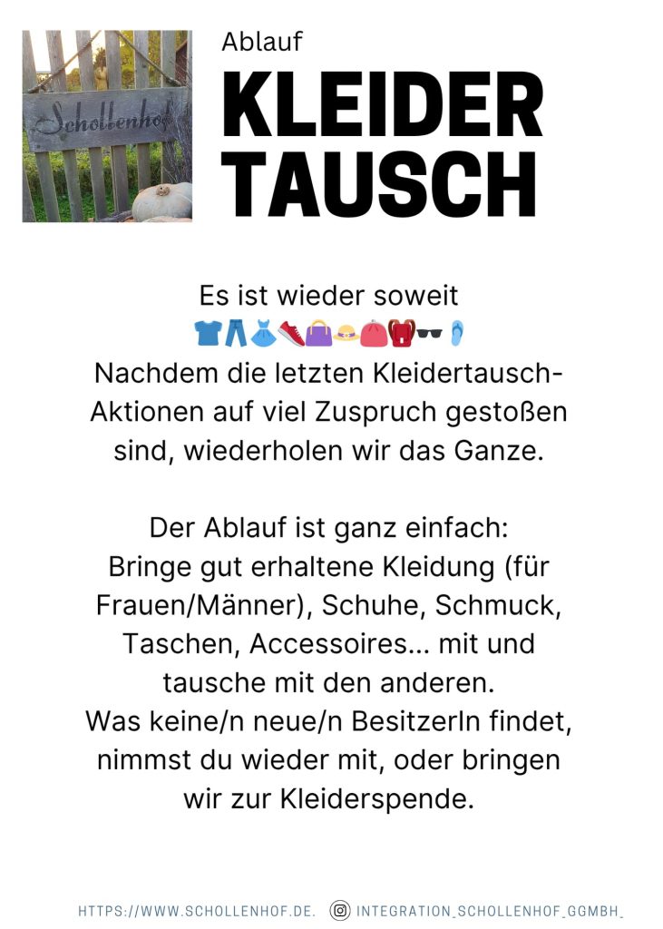 Es ist wieder soweit, am Freitag, den 16.10.2026 von 17 bis 18.30 Uhr findet wieder ein Kleidertausch auf dem Schollenhof statt.